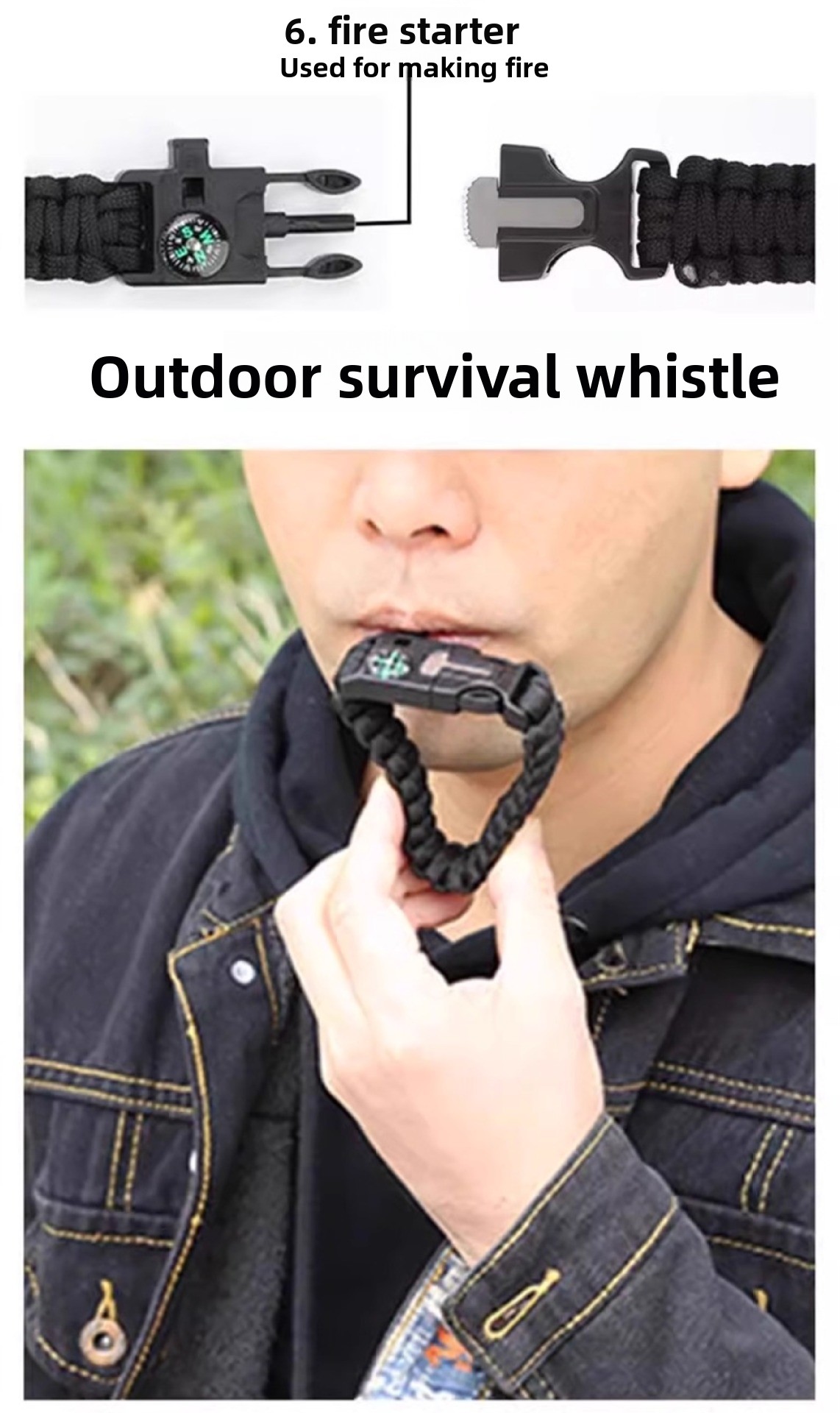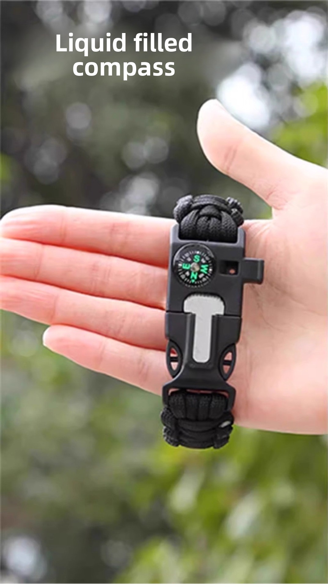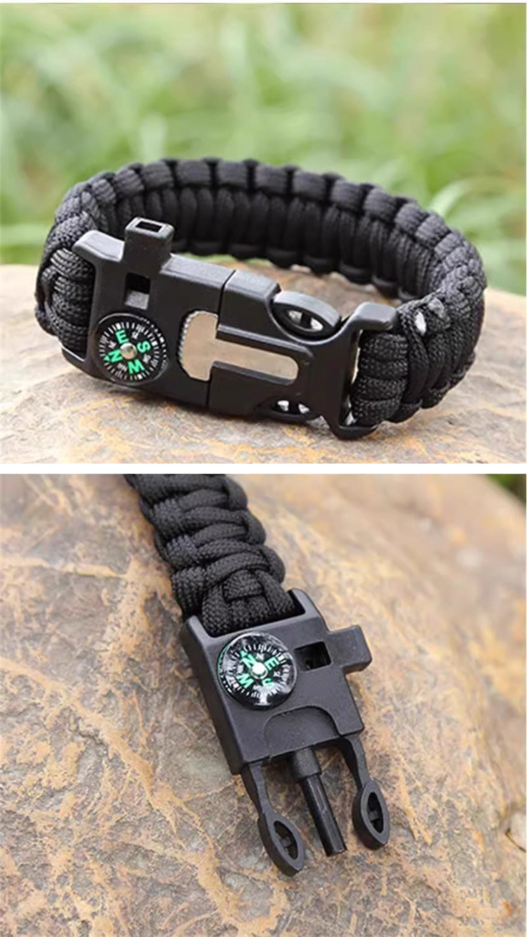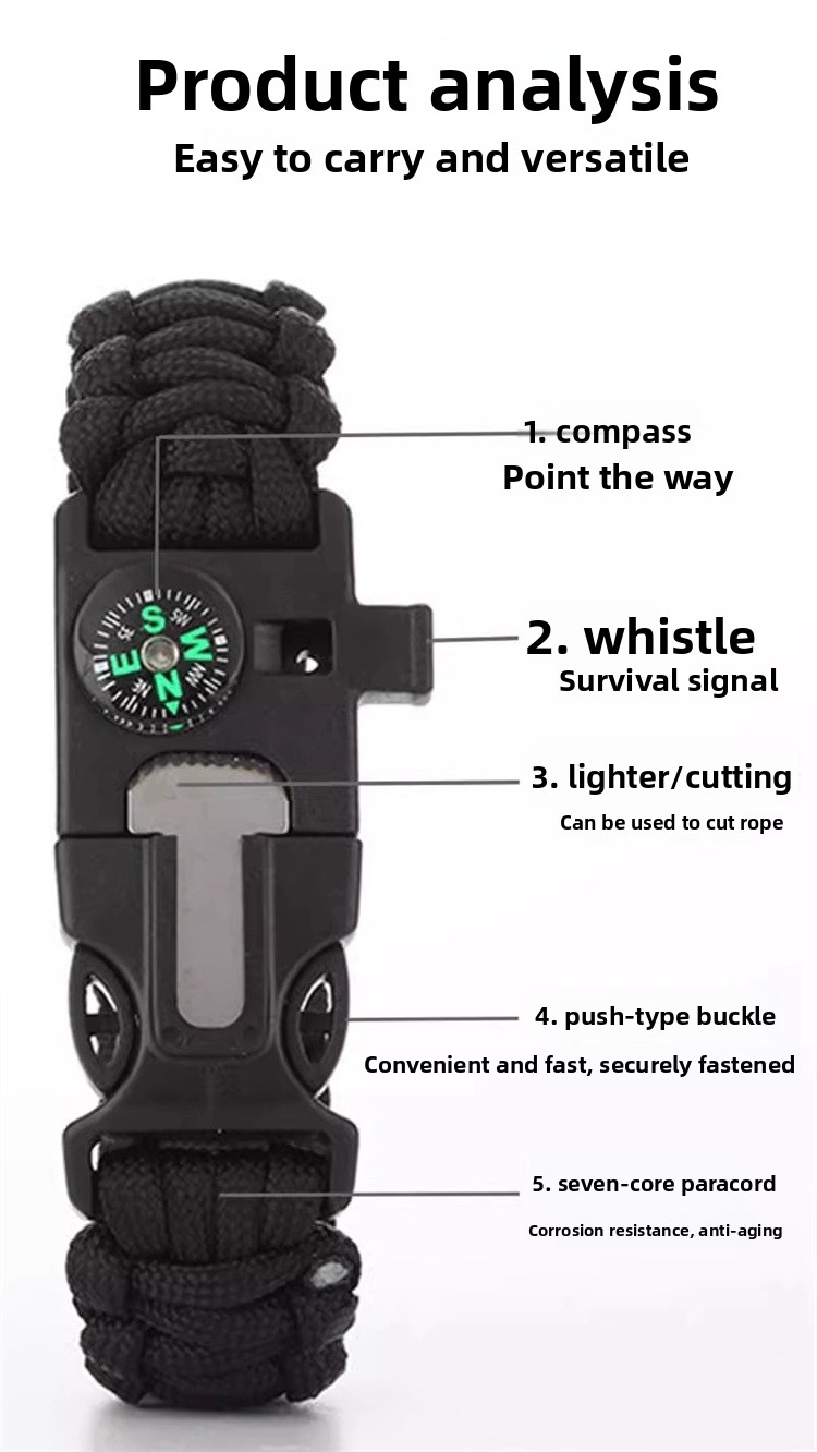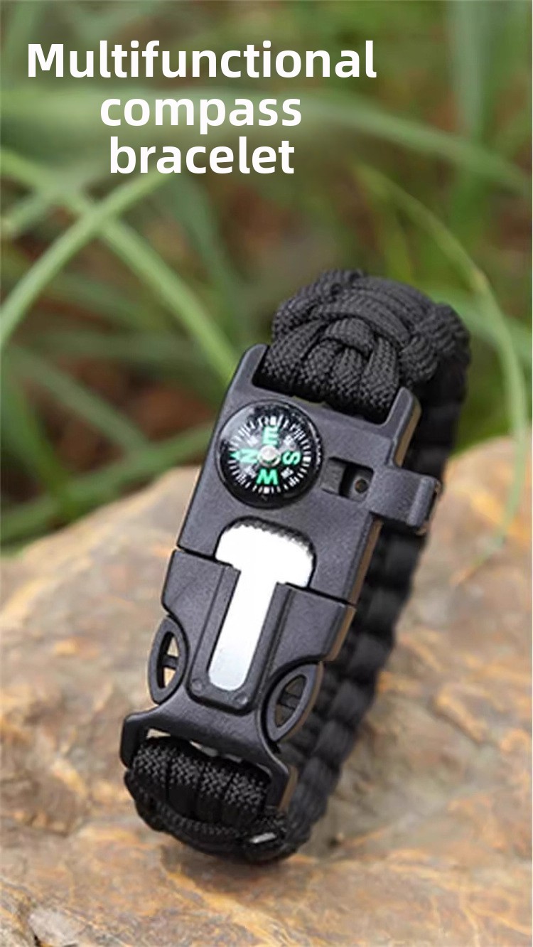 Multifunctional Design: Combines fire starter, compass, whistle, and paracord for versatile outdoor survival use.
