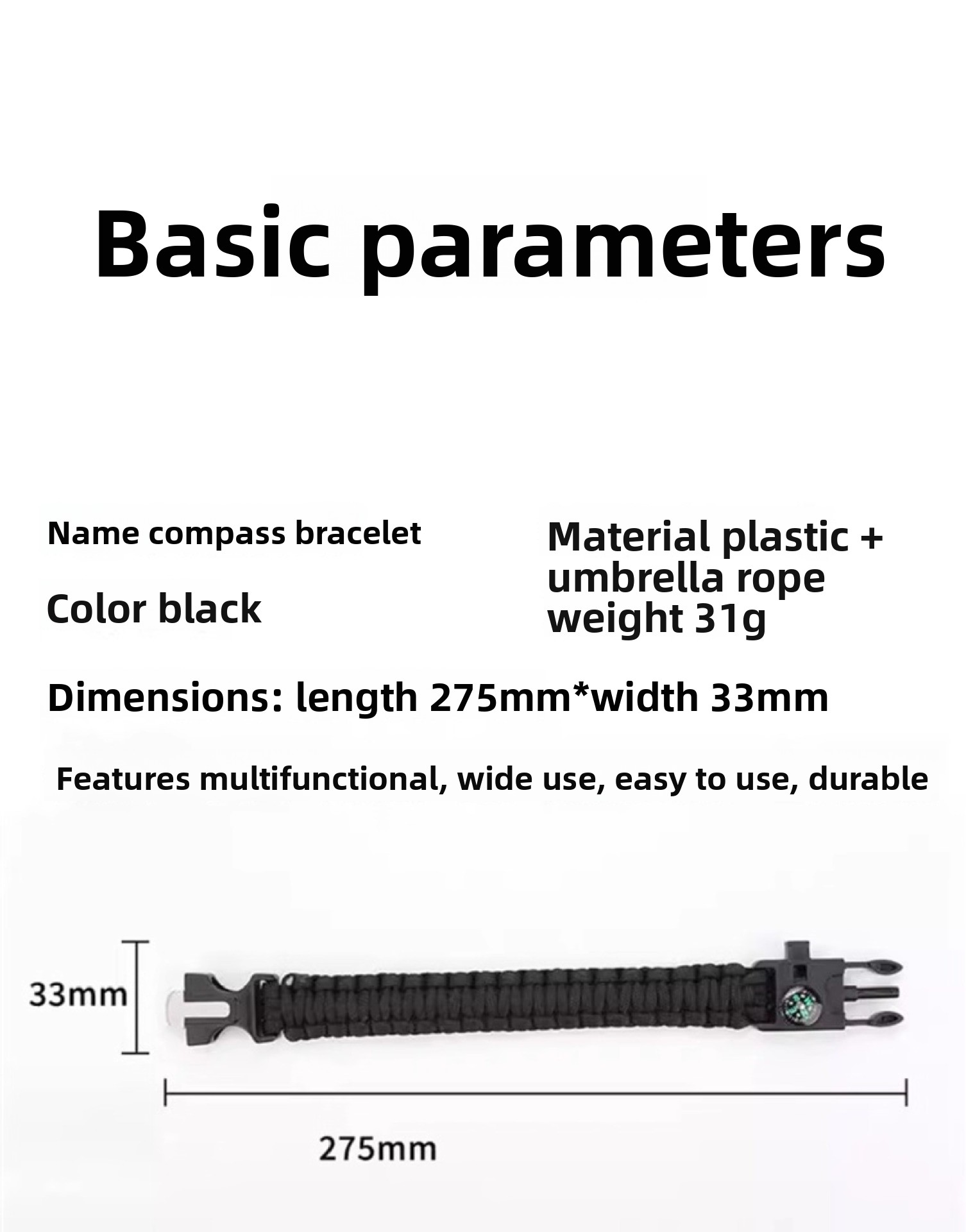 Material: Nylon paracord, metal components (flint, compass)